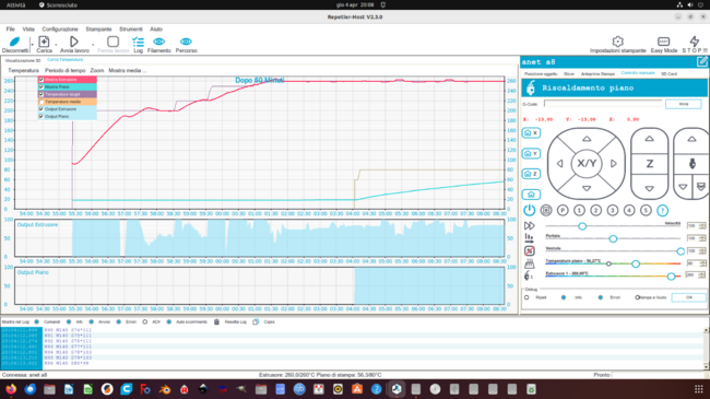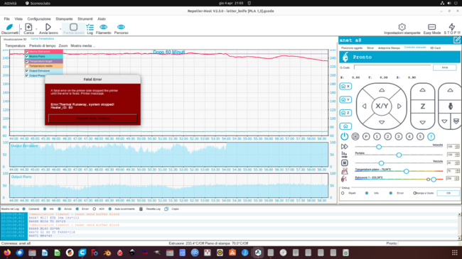 Bella domanda: Le prime prove L'ho lasciato spento. Incluso la prova in cui sono partito da 0 a 260 e non c'è arrivato L'ultima che mi si è arrestata 2 volte di cui la seconda volta sono ripartito con l'ugello caldo avevo acceso anche il piatto nella speranza di lanciare una stampa vera e propria ma poi non ci sono arrivato perché non ha raggiunto la temperatura Potrebbe contribuire anche il lavoro del BED ? Toglie energia all'hot end forse ?? Tra l'altro non dovrebbero passare almeno una ventina di secondi prima di arrivare all'errore ma nel mio caso la temperatura montava sempre non ci sono zone di arresto con andamento piatto boh... Grazie