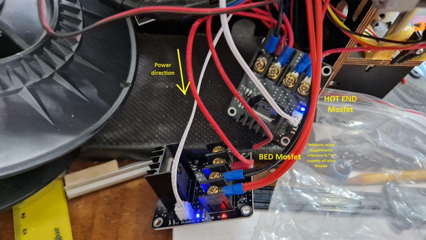 FORSE CI SIAMO: Grazie alle dritte di Eaman E Killrob ieri mi ero messo a misurare la tensione ai capi di alimentatore e Mosfets e avevo notato che uno dei mosfet (quello dell'hot end) aveva in uscita circa 1V più basso rispetto all'altro. Ed in particolare c'era un piccolo calo quando accendevo il piatto. (Forse non era così determinante? ma proviamo ad approfondire) Inizialmente volevo escluderlo e tornare ai collegamenti originali ma poi stamattina mi sono svegliato con l'idea di invertirli. Invertendoli la stessa caduta di tensione mi rimaneva non sul nuovo hot-end ma sullo stesso mosfet che adesso alimentava il BED. Motivo: Molto probabilmente perché il primo era collegato direttamente all'alimentazione della main board (in alto nella foto) e il secondo (in basso nella foto) riceveva dal prima. Probabilmente ho pure fatto male le giunzioni dei faston.. IN OGNI MODO: Accendo contemporaneamente HOT END a 260 e piatto a 80°C e meraviglia delle meraviglie: il riscaldamento arriva a compimento. Lo lascio lavorare per una decina di minuti e l'errore non si presenta. Avrò risolto il problema? Speriamo l'unica cosa adesso lo devo testare con delle stampe vere e proprie che stamani non avevo tempo di lanciare. In ogni modo anche se non sarà la soluzione definitiva la pista giusta è quella dell'alimentazione. Se poi volessi cambiare l'alimentazione per andare a 24V: Il piatto credo già sia compatibile se cambio cartuccia e alimentatore sono sufficienti o ci sono altri componenti da aggiornare? I motori credo si adattino da soli fornendo maggiore velocità e coppia senza necessità di sostituzione.... GRAZIE DI NUOVO A TUTTI -