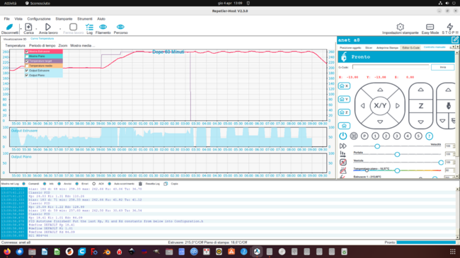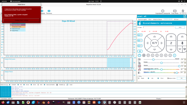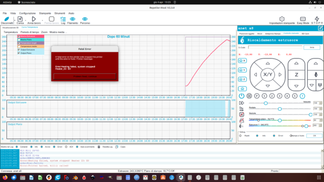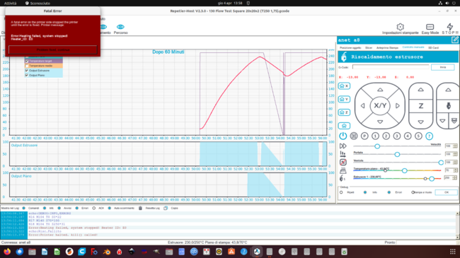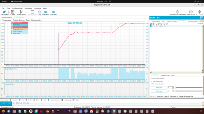 Annoso problema con cui mi ritrovo non sistematicamente ma spesso con la mia ANET A8 Sopratutto quando devo stampare ad alta temperatura La stampa mi si arresta mostrando i messaggi di errore allegati. Nel passato ho cambiato corpo riscaldante, termistore, rifatto PID, non posso pensare che il problema sia la mainboard perchè spesso funziona bene. Per alte temperature (PETG e ultimamente PET) vedendo che non raggiungeva la temperatura, quello che ho fatto per risolvere la maggior parte dei casi durante le stampe è abbassare la velocità della ventola Oggi per andare oltre ho voluto fare qualche cosa ulteriore: Prima ho provato a scaldare a 200°C (temperatura tranquilla) e monitorare la curva temperatura. Tutto bene non ci sono state fluttuazioni particolari ed allora ho fatto la stessa verifica spingendomi a 260°C e anche qui è filato tutto liscio Quindi ho deciso comunque di fare un PID autotune a 260 al posto del consueto 200°C che ho fatto più spesso nel passato. La foto sotto mostra il monitoraggio della temperatura durante questo Pid Autotune Essendo andato fino ad ora tutto liscio ho fatto un nuovo riscaldamento a 260 ma questa volta mi è uscito il msg di errore. Vedendo la curva di temperatura mi sembra che lei poverina sia sempre stata in pendenza ma evidentemente non ha fatto in tempo a raggiungere il suo target. (v immagine sottostante. Non mi sembra così problematica) L'unica differenza con il primo riscaldamento è che sono passato dai 200°C intermedi. Potrà mai essere questa la causa che dovendo fare un salto più alto il sistema va in timeout e si blocca? Altre volte a dire il vero mi succede anche subito dopo una stampa riuscita bene quando riscaldo subito di nuovo l'ugello (che però è già caldo e quindi il tempo per portarlo a 260 è sicuramente inferiore) -
