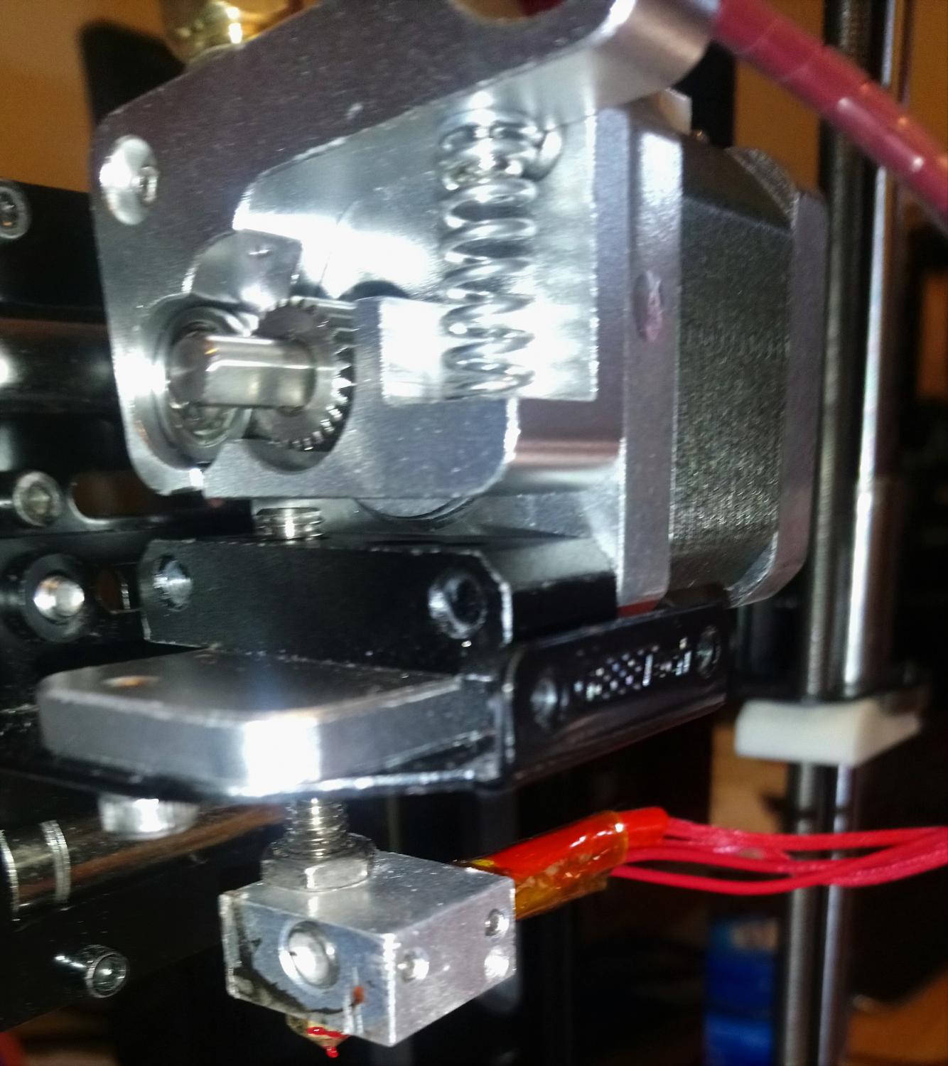 Ecco qui, come vedi tra il supporto nero e il trascinamento in alluminio ci saranno 3 mm, ho avvitato la gola per alzarla. Già che c'ero ho provato ad estrudere a mano inserendo un pezzo di filo, mi sembra di poter escludere che il nozzle o la gola siano intasati, esce regolarmente. -