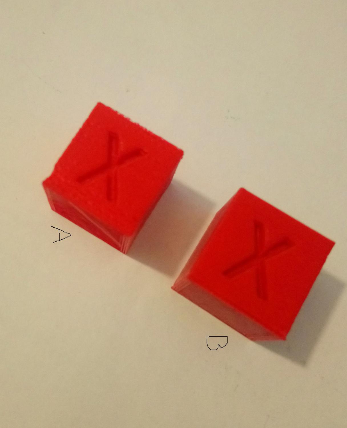 11. Giusto per associarmi al gruppo, pure io ho problemi di estrusione con la mia i3. Premetto, l'ho comprata usata e non l'ho ancora attaccata al pc, ne sto assemblando uno alla benemeglio per lo scopo, intanto la uso con la scheda SD. Software uso repetier-host V 2.1.2 e slicer for prusa ultima versione. Inizialmente ero riuscito a migliorare la stampa, dalla allegato potete vedere il cubo A prima delle modifiche il B dopo le modifiche. Montando,o meglio cercando di montare, una griglia per la ventola dell'estrusore (ho al momento solo la ventola standard) ho smontato il blocco e da quando l'ho rimontato il filamento non scorre più uniformemente. Ricalibrazioni del piano, smonta e rimonta il tensore, estrusioni manuali, tutto sembra funzionare, ma durante la stampa sento i classici tak-tak e non estrude, ho aumentato la tensione della molla nel tensore e la situazione è migliorata, ho regolato anche il voltaggio di riferimento del motore sulla scheda e l'ho portato a 0.85V. Questi i risultati, quindi non mi posso lamentare ma se faccio il raft, quando esegue velocemente lo strato il difetto si ripresenta. Cosa posso modificare ancora per risolvere il problema, che ripeto, prima di smontare la ventola non si presentava?