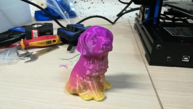 Ti capisco XD dopo chissà quanto tempo finalmente vedi la luce in fondo al tunnel Secondo me sbagli il filo. C'erano dei filamenti di prova? Se no prova un filo Geeetech. Quelli non soffrono di bridging e possono stampare il cane come il mio. Solo, se non ne hai uno, ti consiglio di iniziare col geeetech bianco.