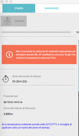 3. Ciao ragazzi, ho una stampante xyzprinting DA VINCI Mini e ho comprato una cartuccia TOUGH PLA ma prima della stampa, dopo aver regolarmente spurgato l'ugello, la stampante mi si blocca con questo messaggio; avete qualche suggerimento per cambiare software di stampa? ...o anche crakkarla ? Grazie!