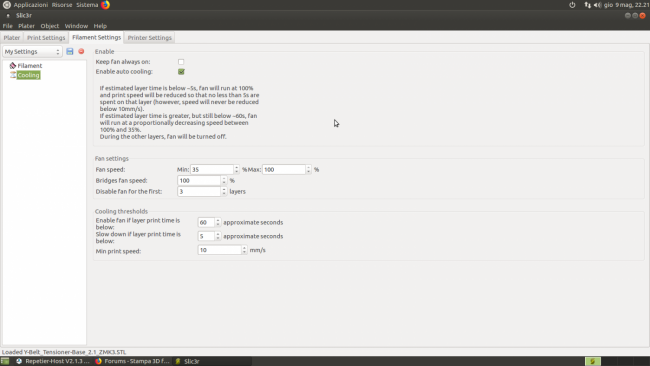22. mi servirebbe una cosrtesia poiche io ci faccio poco anzi niente ancora con i gcode mi controllereste questo gcode e mi dite dove ho sbagliato in slic3r visto che la ventola invece che dopo il 3°layer come gli avevo detto di partire non mi parte per niente ma la devo azionare a mano da reptier e anche da li dopo che l ho attivata resta attiva per 2 minuti poi si spegne grazie scusate Y-Belt_Tensioner_2.1_ZMK3.gcode
