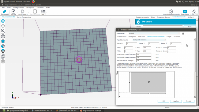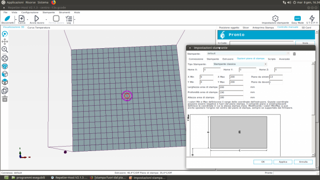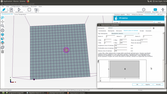 EUREKAAAA finalmente ho risolto grazie a te ti sono debitore ti bonifico una birra 😉 allora casomai servisse a qualcuno ti spiego le prove che ho fatto queste le impostazioni di partenza dove il piano era spostato logicamente con le misure reali di stampa che mi hai dato tu come dimensioni piano e altezza(ho stampato un piccolo cerchio al centro del piano per le prove) e cosi il centro era fuori di 1,3 cm poi ho inserito l offset nello slicer cura cosi facendo ho salvato in gcode e il cerchio è venuto al centro del piano pero era fuori centro con la grafica di repetierhost programma con cui mando le stampe allora ho fatto questa prova a mettere anche dentro repetier l offset ma veniva sempre piu decentrato allora l ho cambiato in positivo e adesso ho tutto centrato file su cura file su repeteir e finalmente la stampa reale uff che faticata ahha scherzo la fatica la fate sempre prima voi e noi sfruttiamo i vostri sudori :)(anche se non ho capito perche in repetier gli serviva il valore positivo invece che negativo ma a sto punto non fa niente)stessa pratica credo che devo farla per verificare il cntramento dell asse y anche se ho notato che sbaglia di 2 o 3 mm percio niente va bene cosi ho fatto bene oppure ho risolto a culo?:) ps domanda fuori dal posto che scheda sd usi su questa stampante perche a me ne legge nessuna ho provato micro con adattatore da 16gb da 8gb e 2 gb sd grandi da 16gb e 8 gb dicono che è un problema di sd non di firmware tu che dici? -