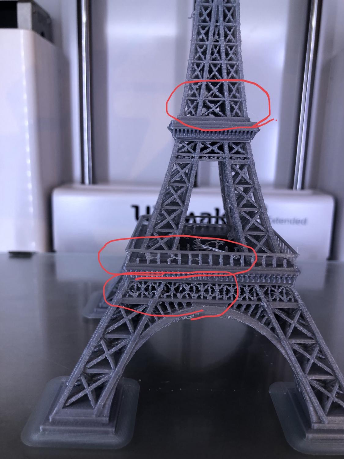 5. Ciao a tutti, sto provando più volte a stampare una tour eiffel ma le linee sottili vengono male e a volte pure non complete, vi allego le foto e aspetto i vostri consigli gtazie
