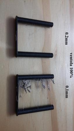 Rieccomi con un po di risultato sono partito col test di @Tomto dopo aver sostituito il nozzle andando ad impostare la ventola al 50%. Riprendendo i valori di retraction dal profilo di @FoNzY con temperature nozzle 210 °C e temperature bed 50°C, retraction 4.9mm e speed retraction 40mm/s e z-hop height 0.3mm. Sia con layer 0.2mm che con layer 0.1mm non c'era verso di risolvere il problema anche variando i valori. Sicuramente per la ventola lenta che non produce un raffreddamento abbastanza repentino del materiale fuso. Salendo con la velocità ventola fino a 100% e andando ad impostare temperature nozzle 210 °C e temperature bed 50°C, il valore di retraction 3.5mm e speed retraction 45mm/s, z-hop height 0.3mm che aveva dato buoni risultati nel test della torre che ho fatto settimana scorsa. Per layer 0.2mm c'era qualche filamento sottile, sul 0.1mm invece il problema persiste Andando semore con ventola 100%, temperature nozzle 210 °C e temperature bed 50°C a retraction 4.9mm e speed retraction 40mm/s, z-hop height 0.3mm. nel caso layer 0.2mm c'è qualche filamento sottile mentre nel caso layer 0.1mm il problema persiste qua un po di provini con layer 0.2mm e retraction 4.9mm andando a variare la speed retraction da 30mm/s a 70mm/s e pure un paio di prove con retraction 3.5mm e 6.5mm i filamenti sottili ci sono in tutti i casi. può essere un problema del materiale? avrà preso umidità? perchè sui provini con layer 0.1mm il problema è peggiore?- 100 risposte