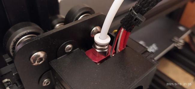 Provando a sfilare il pezzettino dal filamento si è rotto il filo e ora ho il pezzettino in mano con all'interno il filamento... Ma non penso che sia dell'estrusore, immagino che sia un pezzo dove il filo entra nel cavo che porta all'estrusore. Attendo vostri consigli per la risoluzione del problema.