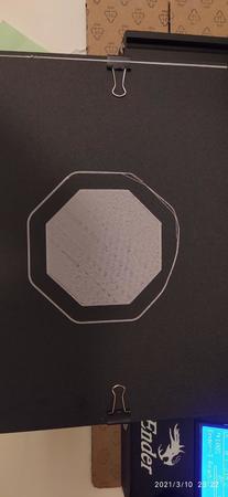 Ciao a tutti. Ho fatto la calibrazione e ora sto stampando un test. Naturalmente mi sono dimenticato di sostituire il piatto con quello di vetro (🙄) e non ho idea di dove ho messo la spatolina per togliere la stampata... Che chiavica. Alla fine della stampa lascerò raffreddare il tutto e, alla fine, si staccherà. Ha finito ora e sta abbassando in automatico la temperatura del piano di stampa e dell'estrusore: bene così. Ecco la foto del test: l'adesione, che ho settato in skirt, ha un'imprecisione sul posteriore sinistro e la stampa in genere non è un granché. Sicuramente devo mettermici con calma e studiare bene tutti i parametri e fare delle prove. Ma almeno ha stampato. Ho visto che le molle sono da 25 mm, come da voi evidenziato dovrò alzare l'endstop di Z. Tanto, una volta montate, devo rifare tutto. Ora collasso (felice della mia prima stampa anche se non perfetta). A domani.