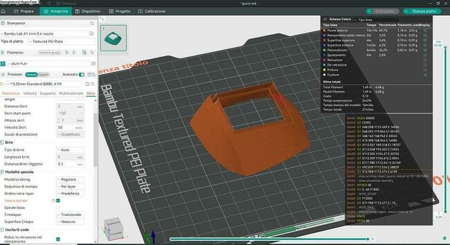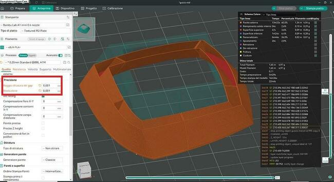 14. Modificando gap e risoluzione come in foto risulta stampabile in vase mode e senza cuciture. Ho utilizzato il preset standard della A1 mini ma dovrebbe funzionare per tutti. ho dovuto riprovare più di una volta perché ogni tanto orca si bagga P.S provo a mandarlo in stampa voglio vedere cosa succede.