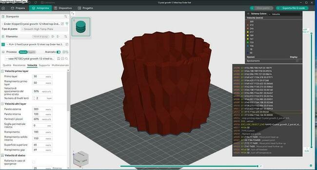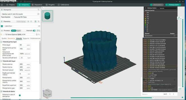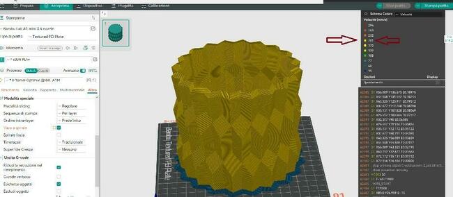 11. Tomto torna alla carica.... Il primo slicing è di @eaman e come si può vedere dalla foto arriva a 300mm/s Il secondo è mio ma sebbene sia impostato a 200mm/s la velocita di stampa non supera i 60mm/s in vase mode. Dove sbaglio ? Oppure è probabile che i preset della A1 mini non sono modificabili.