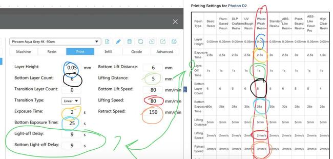 Ho fatto un raffronto fra i parametri di Chitubox e i dettagli dal sito Anycubic. Ci sono alcuni parametri che Chitubox ha in più rispetto a quelli di Anycubic e viceversa… non saprei cosa mettere, inoltre… se cambiassi il Layer Height a 0,01 dovrò ridurre in proporzione l’esposizione? (Ovvio che farò dei test, ma almeno avere un’idea dei primi valori in modo da non allontanarmi troppo da quelli giusti, è sapere di quanto mi devo scostare per i successivi tentativi… tipo ogni 5s, ogni 10mm/min…ecc…) Anche cambiando versione ci sono altri parametri, gli ultimi 3, nella colonna di sinistra e anche di destra grazie -