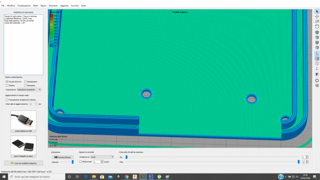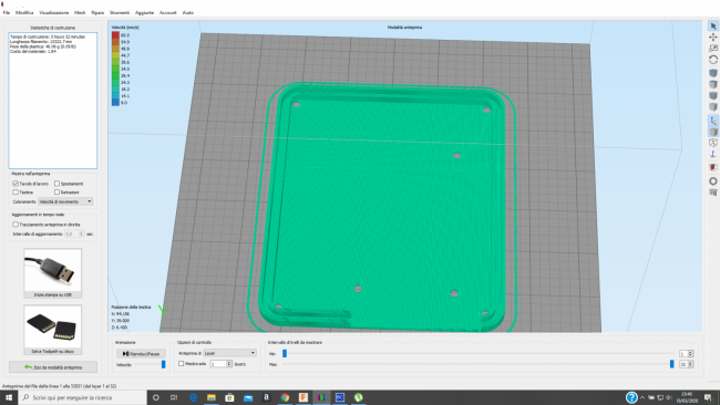 Ciao Whitedavil, stavo vedendo nel frattempo che i fori che vengono stampati fanno parte della velocità che porta la voce "Undespeed di contorno". Abbassando questa velocità abbasserà i contorni dei fori, che è quello che voglio, ma abbasserà anche la velocità ai contorni esterni della base, che in questo caso non hanno bisogno di un abbassamento della velocità. Con un conseguente rallentamento della stampa . Nella pirma immagine si vede che la velocità è sempre la stessa in tutti i layer e in tutti i punti dei layer. Nella seconda immagine invece ho abbassato la velocità dei contorni, e in effetti ha abbassato la velocità dei contorni dei fori, ma anche quella del contorno della base. Io invece vorrei fare in modo che abbassi solo la velocità dei contorni dei fori e non quella del contorno della base. -