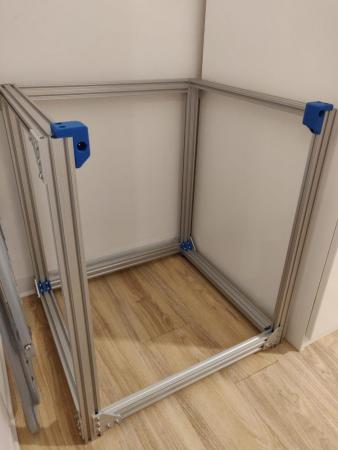 Ho trovato 10 minuti di calma per proseguire con il montaggio Frame quasi completato. Mi mancano due montanti, mi pare, più ovviamente quelli a supporto di Z e Y Ho anche messo degli angolari stampati, 4020 invece dei 2020 previsti. -