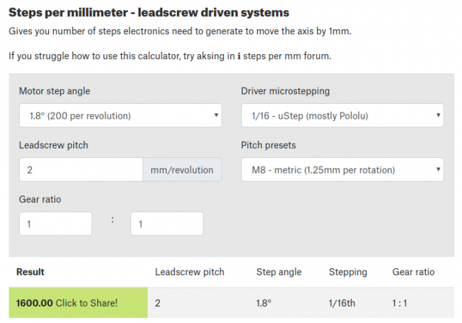 @Tomto ma i nostri motori Z e la T8, sono da 1.8° e 2mm di pitch? Perché stando al calcolatore prusa, gli step/mm dovrebbero essere 1600, non 400