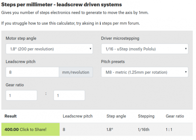 Io ho questa vite: https://www.amazon.it/gp/product/B077MZKFG8/ stando ad Amazon, il pitch è 2mm Se però li inserisco qui: (ignora il preset della barra, è un preset, non fa altro che variare il pitch): lui mi dice 1600 Per avere 400, devo mettere pitch 8mm: non capisco.... (magari tutti i miei problemi nascondo da quando ho cambiato la barra senza variare gli step/mm, dopo si che mi incazzo)