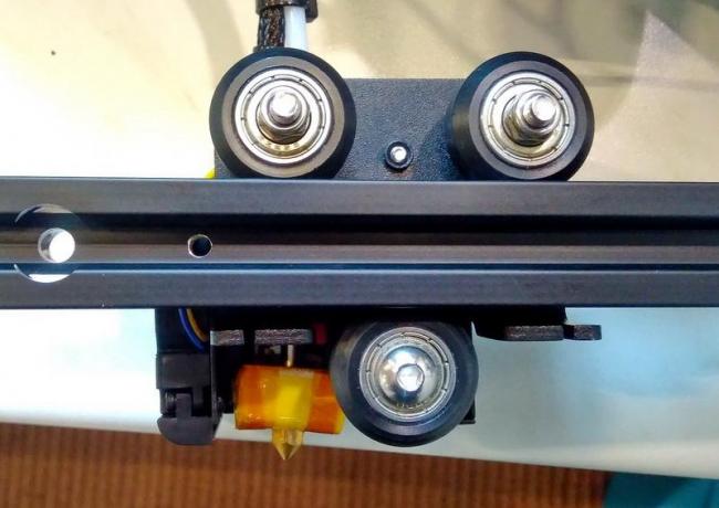 @Tomto ho capito tutto. Guarda la foto. Quando ho cambiato le ruote, avendo queste un doppio cuscinetto, il cuscinetto aggiuntivo fa spessore rispetto a quella originale Geeetech. Lo spessore quindi ha spostato il carrello di X in avanti, finendo fuori asse rispetto alla cinghia. Quattro soluzioni: 1. Rimetto su x le ruote vecchie (bisogna smontare tutta la stampante) 2. Provo ad arretrare la cinghia sul carrello, ci sono circa 2mm di margine, forse bastano 3. Disegniamo (o meglio, "qualcuno" senza fare nomi, disegna) un nuovo carrello, sfasato quel tanto che basta per rientrare nella vecchia posizione 4. Sposto la cinghia, ma come ? Strano che però la cinghia X slitti solo con il Marlin 1.1.8 e non con il 2. Con 1.1.8 non riesco ad andare nemmeno in home, slitta quasi subito. Forse ha le accelerazioni molto più alte 5: compro il carrello della Ender, che ha lo stesso 2020 come asse, la stessa cinghia ma le ruote a due cuscinetti quindi sicuramente sono spessorate il giusto. Tutto questo perché io non ho un eccentrico più basso di quello originale in modo da compensare con il maggior spessore delle ruote