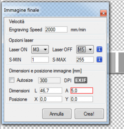 Ok grazie, sul sito di lasergrbl, ho trovato un pacchetto di pulsanti ho installato quello, tra i vari c'erano anche quelli che mi servivano :) Riguardo la parte in cui ti chiedevo dove trovavo M4, dove mi hai indicato tu trovo solo M3, boh non so perché. Oggi ho continuato a fare prove, ho provato a stampare una lettera A, finalmente sono riuscito ad avere una lettere incisa per bene senza sbavature o troppo marcata, per il legno che sto usando attualmente, senza averlo trattato perché devo andare a comprare l'impregnante, devo mettere come potenza massima 135 e velocità 2000. Se diminuisco la velocità inizia ad andare in profondità, quindi dicamo che devo giostrare velocità-potenza massima. Devo ancora però riuscire ad avere una scala di grigi, domani ci provo per adesso con S-min impostato a 40 e s-max a 130 non ottengo sfumature, vediamo domani cosa ottengo. Cmq mi sembrava più facile come setup, quasi quasi è più facile la stampante 3d 😅 Hai per caso un file per testare la scala di grigi, già collaudato? Mi interessa capire se il laser riesce a modulare la potenza per creare le sfumature, altrimenti lo restituisco, ho questa fretta di capire, solo per decidere se restituirlo o meno e prendere un altro modello in caso. Teoricamente il laser dovrebbe essere modulabile, visto che ha 3 fili, però nel dubbio meglio provare 😂