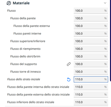 ho provato lo skirt come diceva fonzy ma si staccava lo stesso. Ho livellato il piatto ma solo a 4 angoli, non so come si livella al centro, ho fatto quello che mi hai detto tu (riporto qui sotto la tua frase): "Partendo dal presupposto che nn sia il livellamento, almeno in questa prima fase, proverei ad aumentare il flusso per il primo layer di un 10% e vedere se il primo layer migliora", allego foto per vedere se è la voce corretta. Poi a parte giocare sulle temperature e velocità nulla, Secondo me sono alto di velocità negli spostamenti, perché la parte bassa del cubo che è più rovinata rispetto al sopra è il pezzo dove l'ugello si spostava tra i 3 pezzi messi in stampa, gli altri due erano alti come quel pezzo rovinato. -