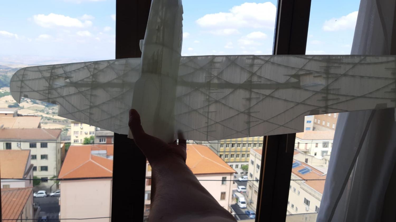la cerniera a carta che usano nei modelli così piccoli, non è nient'altro che un foglio di plastica o di stoffa, poi imbevuto di cianoacrilato, la si infila in piccole fessure negli alloggiamenti di timoni di coda, elevoni e direzionali. Però considerando che posso stampare sino a 100 micron (forse 50, ma occorre stare cauti) ho scelto un sistema plastica/ferro. circa 430grammi, solo le componenti di plastica ed accessori (comprese cerniere nuovo tipo), almeno nelle porzioni stampate (considera che ho usato una bobina da 1kg e me n'è rimasta più di metà ed ho stampato alcuni pezzi due volte), che sono tutte, l'elettronica la metti tutta nel cupolino, c'è un foro di uscita ed un sistema per bloccare l'ala al cupolino, dalla controluce si dovrebbe vedere anche il tubo che passa dalle ali al cupolino centrale, dove poi raggruppi tutto, che serve anche da ferma batteria, il modellino ha tutte le pareti da 0.42mm (single extrusion wall). Verrà equipaggiato con una batteria 6s 1300mah, motore 650kv, esc 30a e microcamera fpv... Peso stimato al decollo, dopo il montaggio dell'elettronica, circa 850/900 grammi, sono 500 grammi di elettronica e batteria, più alcune cosette extra. Il mezzo è tutto incollato con cianoacrilato, non puoi fare diversamente. non mi fiderei ad usare un solvente che mi disgrega la plastica a single-wall PS: alcune parti sono avvitate, come cupolino anteriore elica, alcuni fissaggi interni ed altre robette di cui prima. PPS: i segni che vedi sono i rinforzi interni, presenti in ogni profilo alare anche reale rigido. è un sistema a nido d'ape. le modifiche sono alla base, oltre le impostazioni... 😄 anche se vorrei provarla una stampante nuova, prima o poi penso che mi prenderò una prusa, se uscirà la mark4 Ti farò sapere dopo il primo volo, ma non avverrà in tempi brevi, me la sto prendendo davvero comoda. -