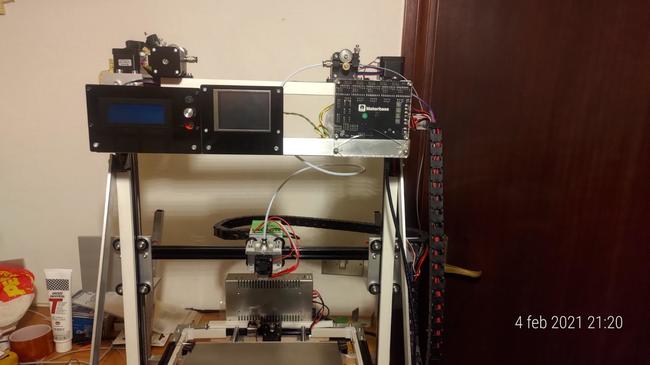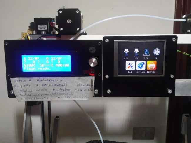 Ciao ragazzi,dopo un annetto o più che me la sono presa comoda,ho finito di modificare e irrobustire una stampante Flsun cinese ormai comprata 4 anni fa,montata e poi smontata più volte per modificare quello che non andava. La stampante è a T rovesciata fatta di estrusi in alluminio 20x20 (prendendo spunto dalle macchine cnc che conosco abbastanza bene) trovo che questo tipo di telaio non sia il massimo per la precisione,per una serie di motivi che vanno dalle inerzie e la cinematica in generale. Monta una scheda Makerbase MKS gen L V1.0 con display lcd touchcreen e lcd monocromatico con rotella di regolazione parametri. Sarebbe dotata di mono e dual extruder che può diventare cyclops,di cui,ho sostituito il mono estrusore con uno di qualità superiore però più compatto dell'originale. Ho sostituito le parti in plastica plastica con l'alluminio fresato con cura e con pezzi di acciaio dolce tagliati al laser,ho messo le guide lineari sull'asse del piatto,i due trafilati in acciaio che aveva montati di serie erano storti,ho costruito un telaietto in alluminio porta filamento (con foro fatto con flowdrill),barra porta elettronica, catene passacavi e tendicinghia in alluminio,un altro po' e montavo le viti a ricircolo sfere della hiwin sull'asse Z ma sinceramente,non ne vale la pena,ultima modifica che ho fatto,visto che la carpenteria laser mi ha cannato il piatto in acciaio inox,ho montato un vetro in borosilicato dello spessore di 3mm da 310x310mm,sopra il piatto in alluminio. Ho messo in linea il piatto con un comparatore digitale millesimale e fra l'altro,ho scoperto,anche dopo aver irrigidito la struttura in più punti,guai toccare la stampante in caso di stampa. Ora che è finita mi ritrovo con i problemi di software che aveva prima,alcuni li avevo corretti,altri non ancora. Il primo che è il peggiore di tutti sono le temperature sballate,avevo postato la cosa ancora una vita fa,ad esempio se imposto 200 gradi sul nozzle/estrusore,misuro 200 gradi sulla cartuccia ma sulla punta dell'ugello,la temperatura è più bassa di una trentina o quarantina di gradi,idem vicino alla termocoppia che dovrebbe misurare la temperatura,il blocchetto che tiene tutto assieme idem,difatti,quando provavo a stampare il pla,dovevo tenere le temperature molto più alte di quelle standard. Uguale situazione riguarda il piatto,temperature sballate anche li. Avevo completato la configurazione con limit switch o fine corsa su tutti gli assi,quindi min e max,compreso pure il sensore autolevel,il totale sono 6 fine corsa. Probabilmente si è cancellata una parte di memoria,avevo impostato l'homing in modo che toccasse tutti i limit switch e anche il punto zero o centro tavola in gergo cnc. Ho aperto Arduino Ide ma sarà che è da tanto che non lo uso ma non riesco a ricordarmi dove ero andato a modificare i parametri dello sketch della stampante. In pratica dovrei fare diverse cose: 1) sistemare i valori della termocoppia,forse agendo sui pid o sull'algoritmo che regola il calcolo della temperatura. 2) rimettere i valori degli assi in sesto,compreso centrotavola. 3) rimettere l'home che va a toccare tutti i punti limite e a settare la corsa totale che può effettuare la macchina. 4) abilitare la stampa da scheda sd sul pannelo con display monocromatico e da memoria usb su pannello lcd a colori touchscreen. 5) abilitare il wifi integrato nel pannello lcd a colori. In pratica,mi servirebbe qualcuno che avesse la pazienza di darmi una mano e qualche dritta,anche perchè mi sono dimenticato parecchie robe sulla programmazione e sui parametri. Vorrei metterla in funzione e usarla per diversi progetti per un periodo e poi rivenderla a prezzo di costo,senza guadagnarci nulla,poi me ne costruirò una stavolta con pieno di alluminio,acciaio inox e dotata di passo passo ad anello chiuso e con viti a ricircolo sfere dove servono e relative guide lineari,però con un telaio totalmente diverso ed elettronica a 32 bit. Cerco di mettere le foto della stampante. Grazie in anticipo. -