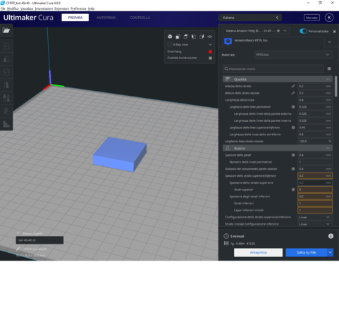 24. Nell'immagine sottostante vedete le impostazioni che ho messo per fare il Thin Wall Test (che tra parentesi adesso spacca il decimo di mm) ed in base a queste non mi spiego i primi comandi elaborati da Cura, anche se riguardano solo lo skirt. Fino all'M117 riguarda lo start gcode che ho impostato, quello che non mi è chiaro sono: G1 F600 Z0.4 G1 F3600 X132.221 Y131.877 Z0.4 da dove caspita lo va a prendere lo Z0.4? G1 X10.1 Y20 Z0.28 F5000.0 ;Move to start position G1 X10.1 Y280.0 Z0.28 F1500.0 E15 ;Draw the first line G1 X10.4 Y280.0 Z0.28 F5000.0 ;Move to side a little G1 X10.4 Y20 Z0.28 F1500.0 E30 ;Draw the second line G92 E0 ;Reset Extruder M117 Sto stampando... G92 E0 G1 F3900 E-3 ;LAYER_COUNT:50 ;LAYER:0 M107 G1 F600 Z0.4 G0 F3600 X132.211 Y131.877 Z0.4 ;TYPE:SKIRT G1 F600 Z0.2 G1 F3900 E0 G1 F1800 X132.669 Y131.521 E0.02778 G1 X133.171 Y131.233 E0.0555 G1 X133.708 Y131.016 E0.08324 ok lasciate stare la stanchezza avanza, è lo 0.2 dell'altezza layer più lo 0.2 dello z-hop durante lo spostamento iniziale per cominciare a buttare giù lo skirt....