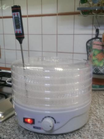 Mi attacco qui, scusate. Ho comprato anche io un essiccatore da 23-24cm, quello classico. All'accensione ronzava come un calabrone, vabbe', aperto e sistemato: dentro c'e' la Cina anni '90. 🙂 Prima di procedere alle modifiche avevo pensato di fare qualche test empirico usando una temocoppia e un termometro da cucina, il classico. Il termomento non arriva fino in fondo ma parte da sopra il primo piatto perche' altrimenti gli arriva l'aria direttamente, e le letture sono fortemente sballate. Ho iniziato a fare delle misurazioni ma ho trovato subito un bel problema. Guardando l'apparecchio con i comandi di fronte, immaginiamo i comandi a "ore 6" e la parte opposta "ore 12". Bene: a "ore 9" (cioe' guardando dall'alto, a Ovest) c'e' una temperatura superiore di BEN 16 gradi rispetto a "ore 4" (sono gli estremi delle misure che ho trovato). E' incredibile a dirsi ma e' cosi'. La misurazione e' stata fatta cosi' come si vede nella foto, e la termocoppia conferma. La termocoppia conferma la cosa, con l'aggiunta che, essendo piccola, potevo misurare a tutte le altezze. Ovviamente, escludendo la zona bassa, dove esce l'aria e arriva direttamente, le misure confermano il problema. Ora, mi chiedo: potrebbe essere il fatto che non c'e' nulla nel box e ci sono solo i cestelli vuoti? Pero' i cestelli vuoti in fondo sono "oggetti" e comunque devono essere riscaldati (hanno una massa non indifferente). Ho intenzione quindi di fare una modifica per mettere una ventolina 8x8 (o 6x6) in cima per aspirare l'aria interna forzatamente per cercare di miscelarla un po'. Come la vedete? -