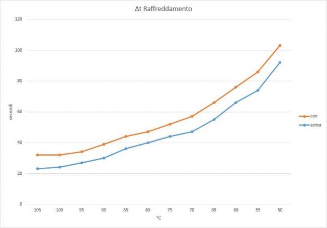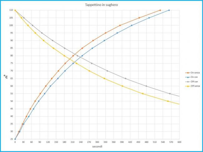 Tappetino in sughero: differenze con e senzaCarsco ha pubblicato una discussione in Hardware e componenti Ho comprato un tappetino isolante in sughero, il piu' economico di tutti, per la mia Ender 3 Pro (220x220mm). E' composto da solo sughero e con ottimo adesivo 3M da un lato. Niente buchi, ma e' stato meglio perche' ho delle modifiche al piatto e ho preferito sagomarlo da me. Volendo fare una tabella di comparazione prima/dopo, ho stabilito queste linee guida. Innalzamento di temperatura fino a 110°, standby per 5 minuti e poi raffreddamento fino a 25°. Tempi presi ogni 5 gradi di differenza. Temperatura ambiente 20°. Il risultato e' diverso da quello che gli utonti scrivono nelle loro recensioni ma e' conforme a quanto pensavo io: il tappetino non diminuisce i tempi di riscaldamento ma li aumenta perche' aumenta la massa da scaldare. Invece, l'effetto piu' interessante e' che rallenta la dispersione termica e quindi il raffreddamento. Praticamente aumenta l'isteresi della variazione di temperatura consentendo al piatto di lavorare nel suo range senza troppi sbalzi, un po' come fa la calza in silicone del nozzle. Inoltre, dati alla mano, tiene il piatto caldo piu' a lungo perche' minimizza la dispersione del calore verso il basso e lo sposta verso la parte alta dove effettivamente serve. Significa che il riscaldatore assorbira' meno energia (cioe' W/h) perche' stara' acceso per meno tempo (attenzione che non ho detto "meno corrente" ma "meno energia", ossia potenza nell'arco di tempo). L'effetto secondario molto piacevole (per me) e' che la parte inferiore del bed resta maneggiabile anche mentre il piatto si trova a 110°. A saperlo prima! Mi si era imbarcata la cassettiera che avevo stampato e messo sotto il piatto proprio da quando ho iniziato a stampare ASA con piatto oltre i 100°. Adesso, col sughero, tocco la superficie della cassettiera a pochi cm dal bed e non supera i 30°. Anche le coperture in PLA dei V-slot dell'asse Y mi si erano imbarcate terribilmente. Con questo sottotappetino non succedera' piu' perche' la temperatura in quel punto non superera' mai i 50° nemmeno in estate. Tutti i dati li ho inseriti in un foglio excell e ne ho estrapolato due grafici: riscaldamento e raffreddamento. Sono molto interessanti, a parer mio. Eccolo qui: Questa che segue e' la stessa analisi ma "tagliata" un pochino per zoomare di piu' sull'asse delle ascisse. Si nota anche come il gap fra le curve del raffreddamento sia piu' ampio di quello del riscaldamento, quindi dati alla mano il piatto resta spento per piu' tempo rispetto a prima. Tengo a precisare che sulla parte superiore del mio piatto riscaldato ho sia la base magnetica adesiva che il foglio di acciaio armonico rivestito col foglio in PEI. Aggiungo altri due grafici: rappresentano il "delta t" misurato ogni 5 gradi e comparato con e senza tappetino. In pratica, rappresentano il gap (in secondi) tra una temperatura e la precendente, misurato ogni 5 secondi. Si vedono benissimo altre cosucce: durante il riscaldalmento la variazione non e' costante. C'e' una sorta di inerzia all'inizio dovuta proprio alla massa superiore (il sughero). Arrivati a 100° diventa piu' preponderante la capacita' del sughero di conservare il calore, e quindi le cose si invertono e si passa piu' rapidamente da 100° a 110° rispetto al piatto senza sughero. Si vedono perfettamente le linee incrociarsi a 100°. Nel raffreddamento, invece, essendoci soltanto dispersione di calore e non entrando in gioco altro, ogni step e' sempre a favore del sughero che conserva sempre meglio il calore accumulato. Il gap e' sempre costante fra le due curve ma a favore del tappetino. Ho omesso i dati sotto i 50° perche' oltre a non essere utili rendono poco leggibile il grafico allungando inutilmente la scala delle ordinate. Spero sia utile a qualcuno.
