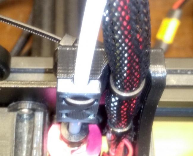 Ciao a tutti. Come tanti di voi con la Ender 3 senza nessun upgrade degno di nota ho l'annoso problema del tubo bowden che si deteriora quando si stampa a 240° e poi si torna a stampare PLA. Il tubo si rammolla/deforma e basta la minima piega durante lo scorrimento su Y per danneggiare una stampa con problemi di sottoestrusione. Per esempio, durante la retrazione il tubo diventa libero di fare avanti e indietro anche di qualche centesimo oppure il movimento sull'asse Y fa muovere il tubo in maniera anomala, magari lo fa ruotare, dando adito ad inceppamenti e sottoestrusione. All'uopo qualche settimana fa avevo buttato giu' un STL per tenere il tubo fermo, ma non abbastanza. Eppure quella stampa mi aveva risolto quasi tutti i problemi! Adesso ho terminato il solido aggiustando il tiro e ho necessita' di qualcuno che lo testi (oltre me, sia chiaro) per verificare le quote nel timore che differiscano da stampante a stampante. Per crearlo ho usato le quote ufficiali, quindi non ci dovrebbero essere problemi. Ecco qualche screen: E' composto da due pezzi: uno che si fissa tramite le due viti della ventola e la boccola sporgente posteriormente della vite superiore della scatolina e uno che strozza il tubo bowden con 2 fascette da 2.5mm mediolunghe (o 4 corte). Le fascette vanno montate cosi': Se qualcuno volesse partecipare mi scriva un PM cosi' invio il file. Dopo averne discusso, lo pubblichero'. Grazie. -
