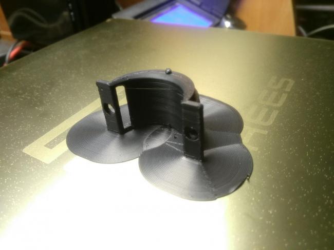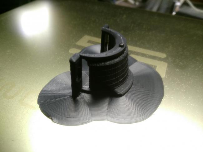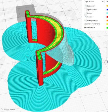 Aggiungo che, arrivato a 110° (il massimo del mio firmware) sono comparse delle "bollicine". All'inizio mi sembrava polvere in controluce (ho i led sopra), ma poi passando la mano mi sono accorto che non venivano via. Poi mi sono tranquillizzato perche' si tratta di una cosa estetica: e' sempre liscio al tatto. Adesso ho avvicinato ancora un po' il nozzle e ho messo 15mm di brim. Non me l'aspettavo: tutto e' andato liscio e il brim e' rimasto perfetto. Il solido era davvero ostico, sottile, alto, arcuato, proprio il peggio per un ASA. Eccolo: L'altezza e' di circa 45mm, nulla di che, ma e' rimasto perfettamente al suo posto. Onestamente non ci avrei scommesso un euro. -