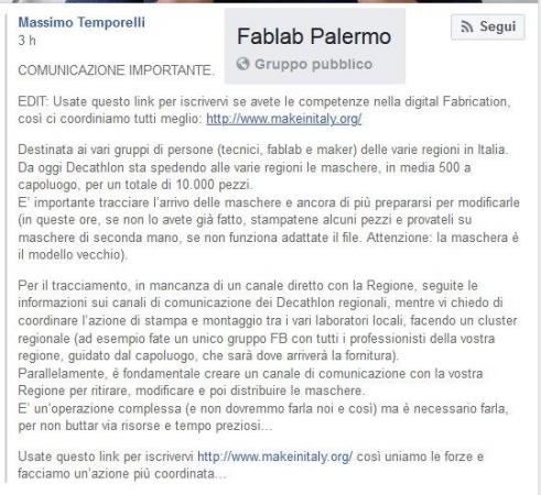 Ecco la risposta del FabLab di Palermo: Ho risposto che avremmo piacere tutti di dare una mano, ma siamo frammentati e ci serve coordinazione a livello regionale prima, e via via a scendere. Vediamo che succede. Ho espresso le stesse identiche problematiche nell'email inviata al Fablab. -