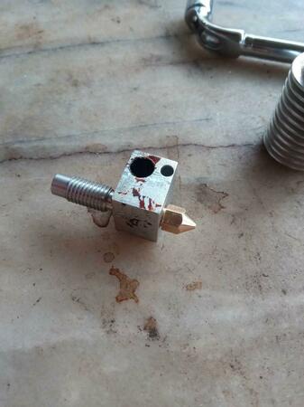 Ecco fatto. Allora: Ho smontato e ripulito tutto usando una barretta tinta di acetone e un tagliarino. Per sicurezza ho cambiato la goletta e l'ugello (tirandolo via ho notato una parte della filettatura era spezzata, forse per averlo tirato fuori) Ora, ho montato l'ugello come dicevamo: ho fatto andare in battuta gola e ugello tenendo un mm di distanza dal blocco in alluminio. MA, visto che parlavate di calore, ho preso la pistola termica e portato tutto a 250° e ho serrato con pinza e chiave tutto quanto. In realtà io ho sempre comprato tutti i blocchetti pre-assemblati da un sito inglese, e l'ugello era sempre in battuta sul blocchetto. Io al massimo facevo un controllo e via. Ma se dite che bisogna fare così mi fido -