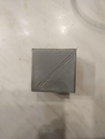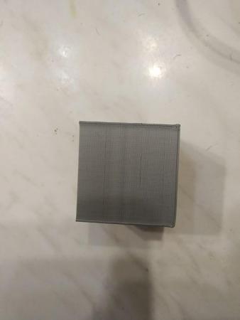 13. Thin wall test fatto, seguendo un video sul tubo. Ho subito notato la scarsa aderenza che fa diventare il primo layer uno schifo e l'ho aggiustato manualmente mettendo in pausa e home. Devo alzare ancora un pò il piatto di mezzo giro per vite e penso di esserci. Dalla foto potete vedere l'aderenza che migliora ai lati, mentre all'inizio è tutta sgangherata. Ho usato un cubo di 40 mm. Usando il calibro tutti i lati sono perfettamente di 40 mm, eccetto il superiore perchè ho stoppato la stampa per poter vedere all'interno. Mancano 3 layer, quindi a naso 1 mm circa, ma non essendo stato estruso ci sta. In più ho valutato un dubbio che avevo ieri mentre stampavo: i vuoti tra layer erano dovuti alla posizione della bobina. In breve, quando avevo il direct, avevo costruito un poggiolo che ho fissato sulla testa della stampante, che mi faceva cadere verticalmente il filamento nell'estrusore. Ora che ho un bowden sulla Z di destra, il filamento, nel momento di entrare nella ruota si piegava e faceva resistenza in un angolo. Allora ho smontato l'impalcatura e messo il corpo che tiene la bobina su una mensola a circa 10 cm dall'estrusore, in parallelo ad esso. In questo modo tutto il flusso, mentre il filo era diretto all'estrusore, non ha lasciato segni. Per provare a vedere se mi sbagliavo, l'ho rimesso in alto e mi ha lasciato un rigo vuoto. Quindi penso che fisserò la bobina alla mensola.