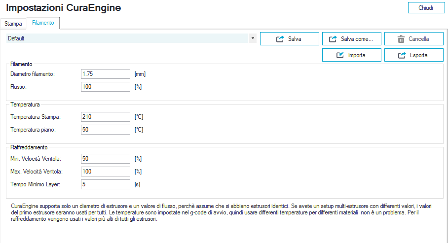 Come slicer uso curaengine tramite repetier host, per il filamento e temperatura ho queste impostazioni di "default", che erano già impostate di loro. Non le ho mai toccate. Per il controllo della temperatura mi sono fatto prestare un termometro a infrarossi da un amico meccanico, e differiva soltanto di 2 gradi. Per il materiale, solamente PLA finora. Volevo usare prevalentemente PLA finchè non diventavo abbastanza bravo per passare a qualcosa di più difficile. fatto, mi estrude 97 mm. Ora dovrei fare 100/97 x 0093 (che è il valore che nel display ho trovato in Esteps), giusto? -