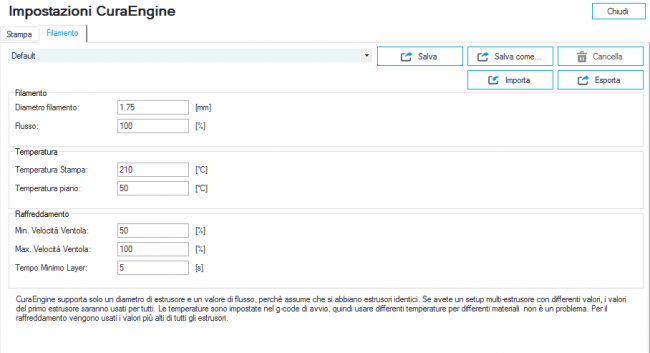 24. Come slicer uso curaengine tramite repetier host, per il filamento e temperatura ho queste impostazioni di "default", che erano già impostate di loro. Non le ho mai toccate. Per il controllo della temperatura mi sono fatto prestare un termometro a infrarossi da un amico meccanico, e differiva soltanto di 2 gradi. Per il materiale, solamente PLA finora. Volevo usare prevalentemente PLA finchè non diventavo abbastanza bravo per passare a qualcosa di più difficile. fatto, mi estrude 97 mm. Ora dovrei fare 100/97 x 0093 (che è il valore che nel display ho trovato in Esteps), giusto?