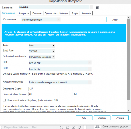 10. Ciao! Dopo aver aggiustato per la ventesima volta la geeetech non ho resistito e ho comprato una anycubic I3 Mega che ho trovato in offerta. L'ho provata con cura, e stampa benissimo. Piatto livellato, nessun problema con shell e infill, e quindi volevo passare al mio "main" slicer, che è repetier host, visto che è da quando avevo la prima stampante che ci ho passato molto tempo e so usarlo molto bene tra settaggi e impostazioni di stampa. Il problema è che repetier, nonostante io abbia seguito alla lettera il manuale allegato alla stampante, settando la porta che il driver mi segnalava(nel mio caso COM9) e il baud a 2500000, repetier continua a darmi errore e non riesco a collegare la stampante allo slicer. Non è vitale che si colleghi, ma mi trovo molto bene con repetier host, e mi da un pò fastidio dover imparare a usare un nuovo slicer quando mi ero così ben abituato ad un altro. Vi lascio due screen del desktop, uno delle impostazioni stampante della connessione, dove ho messo tutti i settaggi presenti nel manuale, e l'avviso che mi esce quando clicco sull'icona "connetti". Voi sapete perchè fa così?