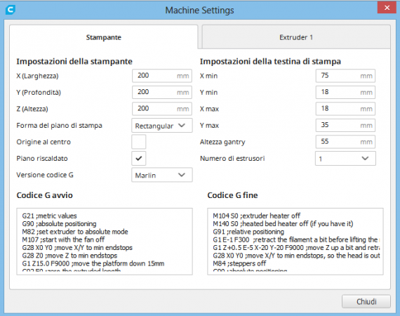 Ugelli differenti: impostazioniMattia Soppelsa ha risposto a Mattia Soppelsa nella discussione Software di slicing, firmware e GCode si, di pla. L temperatura la tengo a 210, il nozzle è pulito, ho usato il kit apposito. Ma dopo aver provato di nuovo a stampare un ciondolo, che è venuto da schifo, ho deciso di cambiare tutto l'estrusore, eccetto il motore. Difatti ho ordinato: https://www.amazon.it/Extruder-ASHATA-Stampanti-Ingranaggi-Stampante/dp/B07GTJYB1N/ref=pd_sbs_328_3/260-5943954-8198640?_encoding=UTF8&pd_rd_i=B07GTJYB1N&pd_rd_r=467ef0a4-82b1-4dc5-a512-a7a40d0fba8d&pd_rd_w=rhQK4&pd_rd_wg=qAH0s&pf_rd_p=fbcaa110-7762-4ba4-93f0-28dd164e130c&pf_rd_r=YE3QYHTVV2G1SYPRAWAK&refRID=YE3QYHTVV2G1SYPRAWAK&th=1 https://www.amazon.it/Redrex-Alluminio-Estrusore-Stampante-Makerbot/dp/B01LQQZPPQ/ref=cm_cr_arp_d_product_top?ie=UTF8 https://www.amazon.it/SIENOC-estrusore-testine-stampanti-Makerbot/dp/B01N79YT8P/ref=sr_1_43?__mk_it_IT=ÅMÅŽÕÑ&crid=2Y37IXK5X8QXZ&keywords=ugello+stampante+3d+0.3&qid=1573691437&s=industrial&sprefix=ugello+st%2Cindustrial%2C199&sr=1-43 Se dopo tutte queste modifiche non mi funziona ancora bene, metterò mano sul motore, perchè ho già sostituito hot end, gola e fatto varie prove allentando e stringendo ogni vite. L'unico mio dubbio rimane proprio la gola che ho comprato, che è 1 cm più corta dell'originale.