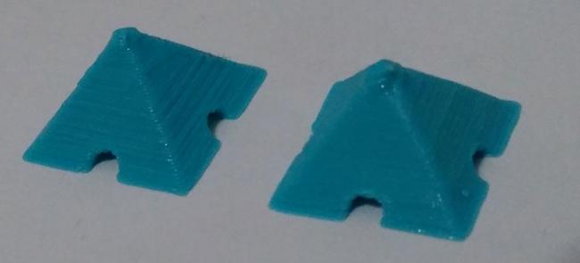 Ok, ho fatto una prova osando e mettendo 0.1 mm di layer Le due piramidi hanno 1,5 cm di lato, la piramide a sinistra è fatta con layer da 0.2 mm, quella di destra con layer da 0.1, sono venute bene tutte e due, solo quella da 0.1 ha le pareti molto più lisce. Il problema è la punta, stampando la punta in un tempo sempre più breve si ritrova a sovrapporre il filamento su un filamento non ancora solido e per questo la punta si deforma, non potendo intervenire sulla velocità in tal senso pensavo di usare le colonne di supporto, per costringere la stampante a stampare una colonna di fianco e così dare il tempo agli ultimi strati di raffreddarsi, solo che su cura non trovo questa funzione automatica... -