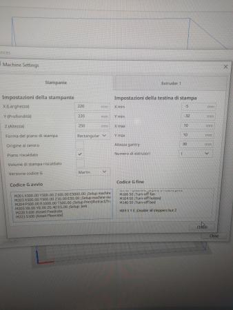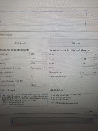 Salve ragazzi, ho formattato il pc e ho dovuto ricaricare tt... installando cura nn mi si modificano le impostazioni della testina di stampa.... cioè mi rimangono a -5 e -32 vi allego foto... in più il programma codice g avvio e codice g fine, dovrò cambiarlo o lasciare quello? O una ender 3 pro.... magari potete spostarmi qualche foto delle impostazioni vostre... anche perché dovrò rimettere anche tt le altre impostazioni