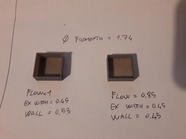 AGGIORNAMENTI ho controllato step/mm di E, 100 da comando ne estrude 102,3 ( onestamente lo lascerò così non credo influisca così tanto ) dopo aver controllato gli step/mm ho fatto il thin wall test Diametro filamento 1.74 flow =1 ; extrusion width = 0.45 risultato wall = 0.53 ma buon primo layer ( la base per intenderci ) fatto i calcoli rifaccio il test flow (calcolato ) = 0.85 ; extrusion width = 0.45 risultato wall = 0.45 ma primo layer ( base ) poco solida e a "corde" conclusioni?? a voi guru del 3D... io la butto li, magari è una cag..ta ma se avessi il nozzle consumato? la punta... spiegherebbe perchè se abbasso il flow mi viene un primo layer più debole ( meno materiale quindi viene "schiacciato" meno dal nozzle ) e per lo stesso motivo tutti quei buchi super regolari nelle stampe... -