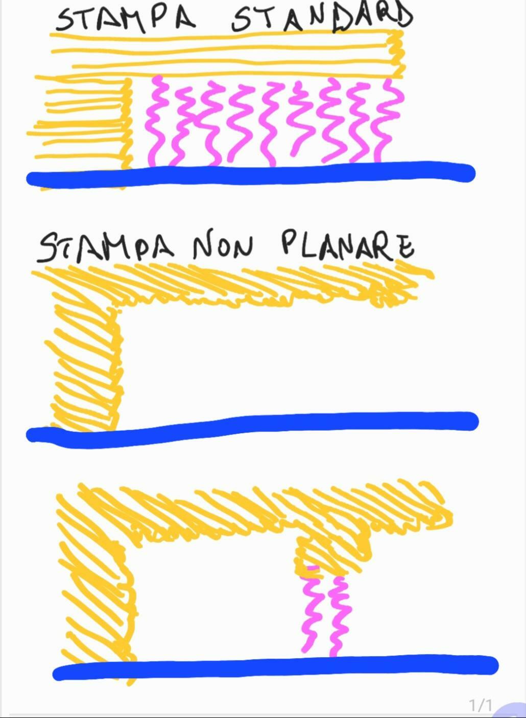 non c'è solo il costo della stampante otto,io per realizzare quello che potrei con una stampante idonea al non planare dovrei metterci anche quello del costoso pva che ha una conservabilita limitata e 10 / 15 ore di tempo per la dissoluzione dei supporti , non metto in dubbio che una testina snodata aiuta non poco.. ma quel che voglio dire è che magari accontentarsi di una stampa non planare di anche soli 10 ° o meno potrebbe essere quanto basta a stampare anche gli sbalzi di 90 °,poi se uno cerca le pareti rifinite anche con 45° di stampa quello è un altro discorso... sicuramente anche pur avendo la possibilità di stampare non planare ci potrebbero essere delle geometrie che obbligano la generazione di supporti,come ho fatto nello schizzo, ma sarebbero sicuramente molti di meno... il piatto mobile non la vedo una soluzione , io intanto (se ci riesco) voglio provare ad installare slic3r per linux e provare un plugin che esiste solo per quella piattaforma.. e se riesco a fare qualche esperimento vi aggiornerò..( il link che hai messo porta comunque ad un sito non sicuro..) -