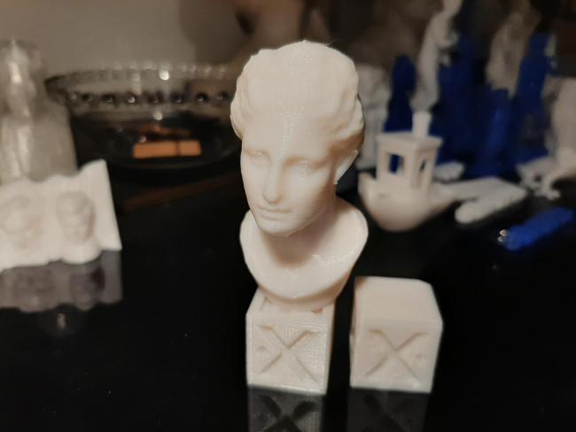 Ragazzi, ultimo aggiornamento sul problema di stampa: Ho verificato un poco tutto quello che avete suggerito, la temperatura era nei valori definiti, però mi sono accorto che alcuni parametri di configurazione della mia Mega S non erano i valori che indica il mio manuale di istruzioni,mi sono addentrato nella jungla dei quei parametri "horribilis" che non si riescono nemmeno a comprendere fino in fondo nel loro significato, non so come abbia fatto, ma sembra che la stampa del "test cube" è più dignitosa di quelle precedenti.Ho inoltre stampato un busto di matrona romana , molto delicato, e a parer mio difficoltoso da stampare, nei piccoli particolare, e pare che la mia Mega S abbia assolto con dignitoso compito il suo dovere. Ovviamente adesso è sotto osservazione, qual "spaghettino" anche se minimo non manca mai, nelle mie stampe.. Ma per il resto lascio giudicare voi la foto che allego: Nel ringraziarvi sempre , arrivederci Ciao P.S. Notare la differenza a parer mio notevole dei due cubi test. -