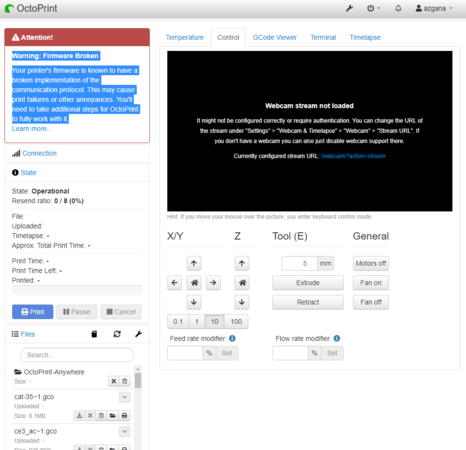 Montato il supporto, collegato il tutto, faccio partire una stampa da micro SD connessa direttamente nella stampante, ma quando avvio Octoprint da Browser (Chrome) e tento di connettermi al live view della cam, mi compare il seguente errore: "Warning: Firmware Broken Your printer's firmware is known to have a broken implementation of the communication protocol. This may cause print failures or other annoyances. You'll need to take additional steps for OctoPrint to fully work with it." Eppure ho installato l'ultimo firmware disponibile sul sito ufficiale Creality. Inoltre non riesco a vedere temperature, gcode, nulla. Vi allego uno screenshot della schermata di Octoprint. Come risolvere?- 86 risposte