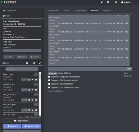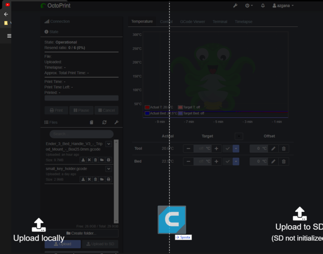 Allora, forse non ho capito alcune cose, che per voi sono ovvie, ma per me che sono alle prime armi non lo sono. 1. Quando tramite l'interfaccia web di Octoprint, trasferisco un file, questo viene messo nella micro SD del Raspberry, giusto? Quando faccio il drag and drop di un file sul browser, dove devo metterlo? (vedi l'immagine allegata). 2. Quando accendete il tutto, qual'è l'ordine in cui accendete i vari componenti? 3. Se durante una stampa lanciata con Octoprint, la connessione o il computer si spengono, cosa succede? La stampa prosegue? 4. Come faccio a controllare Octoprint da smartphone ovunque io sia? 4. Avete qualche link a qualche guida fatta bene per configurare il tutto?- 86 risposte