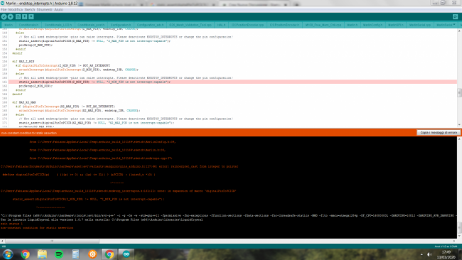 1. Ciao a tutti, ho un problema con l'installazione di marlin sulla mia anet a8. Ho seguito le varie guide per la configurazione del collegamento del 3d touch e i collegamenti dei cavi sono giusti. Ho modificato anche la configuration.h con arduino sempre seguendo le guide, ma quando vado a verificare lo sketch mi da questo errore: Cosa posso fare? Grazie in anticipo.