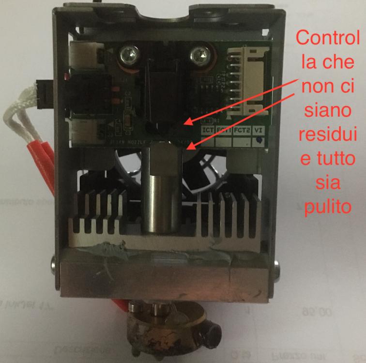 1. Ciao, prova a smontare la testina e controllare se l'ingresso del PLA all'interno è pulito o ci sono residui, vedi foto. Inoltre pulisci sempre bene la testina, sopratutto se rimane ferma per giorni. Paolo