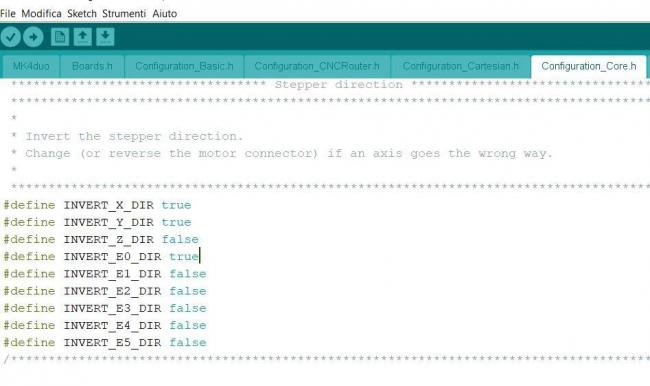 ciao ragazzi, avendo delle brutte stampe ho deciso di cambiare il mio FW con marlinkimbra 4.4.0. Gli endstop funzionano correttamente, ma ho il prblema che gli assi si muovono nei versi sbagliati. Ho provato ad invertire la direzione degli stepper da FW ma non ho ottenuto cambiamenti. come posso risolvere? -