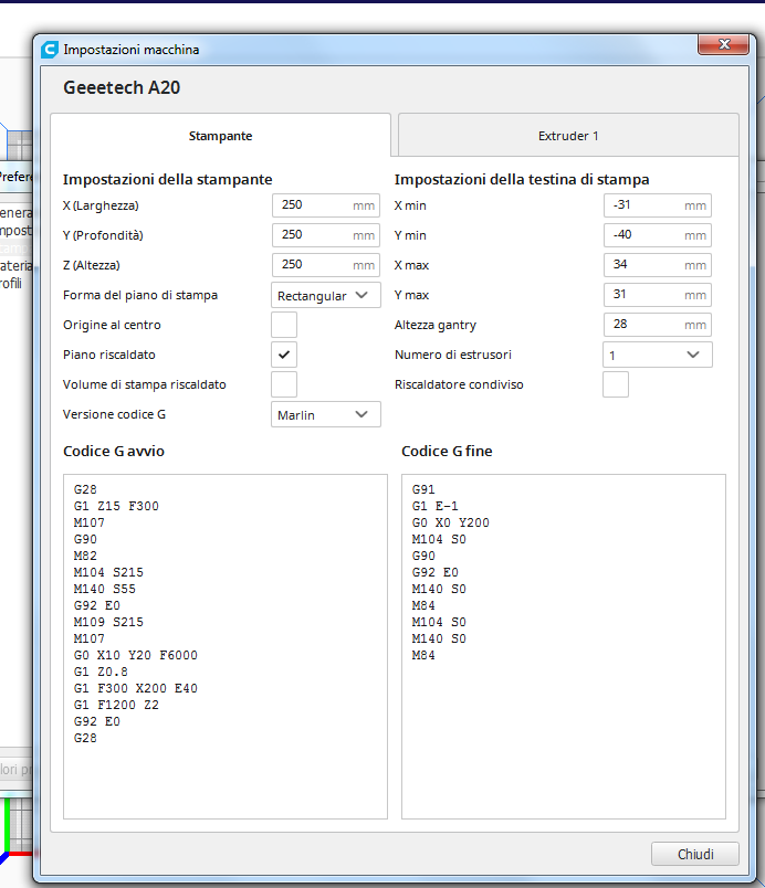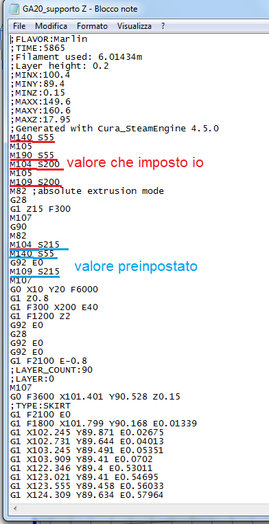 imposto sullo slicer tutti i miei parametri ma, una volta inserita la sd e caricato il file da stampare, la stampante mi impsta di default 215° per l'estrusore, 55°il piano e 100% di fr, infischiandosene di quello che ho impostato io.