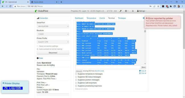 Da quando ho installato Marlin 2.1 alcune volte ottengo l'errore "coil short circuit" che mi sembra provenire da un driver TMC2225. Riporto anche parte della comunicazione seriale tra Octoprint e Marlin. Send: N6027 G1 X103.249 Y117.921 E.00841*108 Recv: ok N6027 P0 B3 Send: N6028 G1 X103.438 Y118.557 E.00841*97 Recv: Recv: E driver error detected: 0x40140010 Recv: coil short circuit Recv: X Y Z E E1 E2 Recv: Enabled true true true true true true Recv: Set current 720 720 720 650 650 650 Recv: RMS current 703 703 703 642 642 642 Recv: MAX current 991 991 991 905 905 905 Recv: Run current 22/31 22/31 22/31 20/31 20/31 20/31 Recv: Hold current 22/31 22/31 22/31 20/31 20/31 20/31 Recv: CS actual 22/31 22/31 22/31 20/31 20/31 20/31 Recv: PWM scale Recv: vsense 1=.18 1=.18 1=.18 1=.18 1=.18 1=.18 Recv: stealthChop true true true true true true Recv: msteps 64 64 16 16 16 16 Recv: interp true true true true true true Recv: tstep 1017 514 max 9539 max max Recv: PWM thresh. Recv: [mm/s] Recv: OT prewarn false false false false false false Recv: triggered Recv: OTP false false false false false false Recv: pwm scale sum 51 66 79 88 23 23 Recv: pwm scale auto -1 -1 0 0 0 0 Recv: pwm offset auto 67 69 112 135 36 36 Recv: pwm grad auto 19 28 79 22 14 14 Recv: off time 3 3 3 3 3 3 Recv: blank time 24 24 24 24 24 24 Recv: hysteresis Recv: -end -2 -2 -2 -2 -2 -2 Recv: -start 6 6 6 6 6 6 Recv: Stallguard thrs Recv: uStep count 845 448 536 959 72 72 Recv: DRVSTATUS X Y Z E E1 E2 Recv: sg_result Recv: stst * * * Recv: olb Recv: ola Recv: s2gb Recv: s2ga Recv: otpw Recv: ot Recv: 157C Recv: 150C Recv: 143C Recv: 120C Recv: s2vsa * Recv: s2vsb Recv: Driver registers: Recv: X 0xC0:16:00:00 Recv: Y 0xC0:16:00:00 Recv: Z 0xC0:16:00:00 Recv: E 0xC0:14:00:10 Recv: E1 0xC0:14:00:00 Recv: E2 0xC0:14:00:00 Recv: Recv: Recv: echo:Driver error Recv: Error:Printer halted. kill() called! Changing monitoring state from "Printing" to "Error" Send: M112 Send: N6029 M112*28 Send: N6030 M104 T0 S0*20 Send: N6031 M140 S0*81 Changing monitoring state from "Error" to "Offline after error" Connection closed, closing down monitor Qualcuno sa da che cosa potrebbe dipendere? -