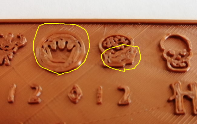 Ciao a tutti, vorrei capire se posso migliorare questa situazione senza impazzire. Nell'immagine ho evidenziato i punti "critici". Qui ho delle immagini di dimensioni contenute (il cerchi con la corona all'interno avrà un diametro di circa 12mm) in rilievo su una superficie piana. La superficie piana viene decentemente. Quello che non mi piace molto sono le superfici, sempre piane, delle immagini in rielievo. Come da foto, queste risultano non perfettamente "coperte" dal filamento risultando non omegenee e non troppo gradevoli alla vista. Il materiale è PLA - temp. 200° - speed 60 - top layer 4 - top thickness 0.8 Su quale parametro potrei agire per migliorare, se possibile, la situazione? Grazie in anticipo come al solito 🙂 -